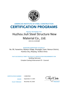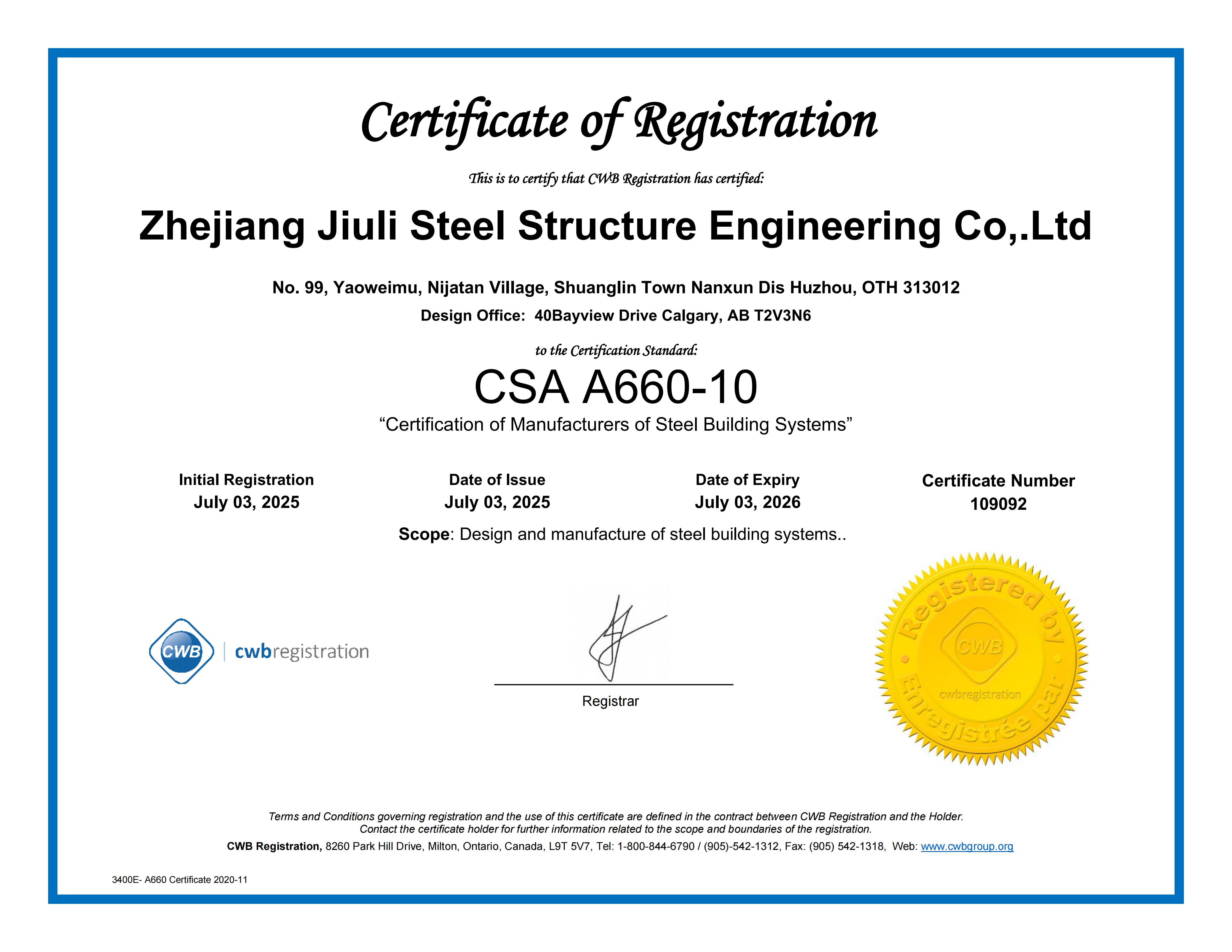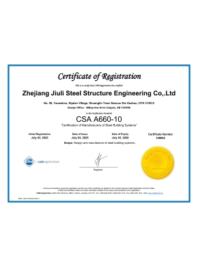 The company has a comprehensive quality assurance system and has passed the certification of ISO9001:2015 quality assurance system. Having the second level general contracting qualification for construction projects, the first level professional contracting qualification for steel structures, and the special manufacturing qualification issued by the Ministry of Construction. We specialize in undertaking the construction of various industrial and civil engineering projects, as well as the design, manufacturing, and installation of steel structures. The company is based in the domestic market and has established multiple marketing offices nationwide, gradually forming a nationwide marketing network and actively participating in international competition. The company has the Canadian CWB certificate, American AISC certificate, European EN1090 and ISO3834 certificate certified by the Canadian Welding Association, and can undertake the export processing of steel components with special requirements from Europe, America, Australia, and other countries. It has successfully established branches in Madagascar and Botswana in Africa. Jiuli Steel Structure is one of the first construction enterprises in the Huzhou region to enter the international market.